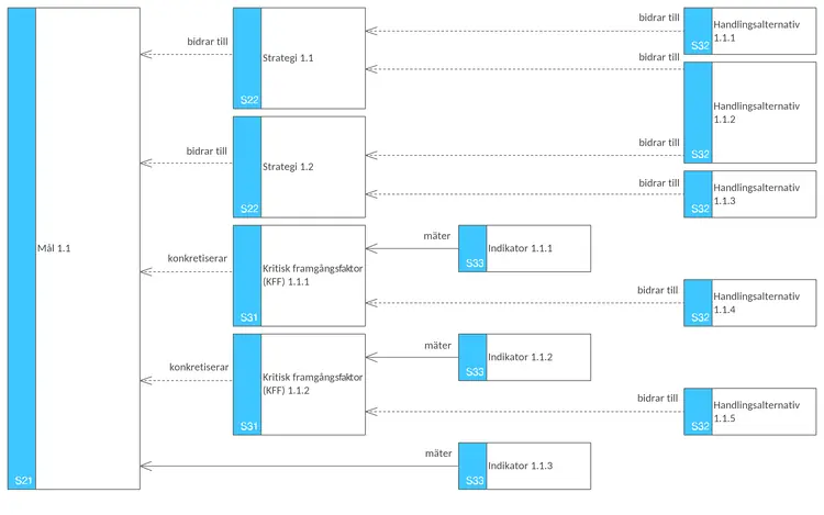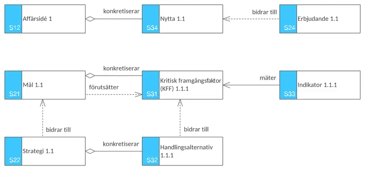 En visuell beskrivning av hur visionen konkretiseras av mål och affärsidé samt vilka strategier som ska användas för att bidra till att målen uppfylls. Användning