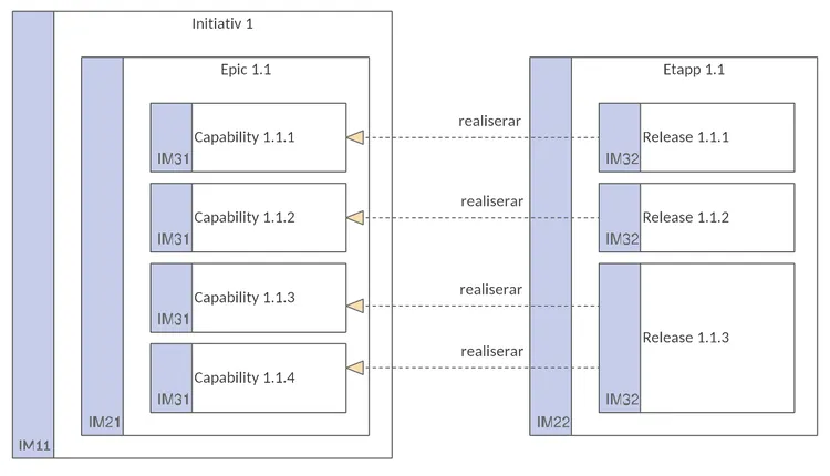 En visuell beskrivning av vad en release avser i termer av t ex process, verksamhetsfunktion eller applikationsmodul; samt vad den ska åstadkomma med avseende på mål (effekt och funktion) och gap. Objekt och relationer - exempel